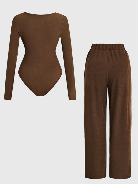 Round Neck Long Sleeve Bodysuit and Tied Pants Set